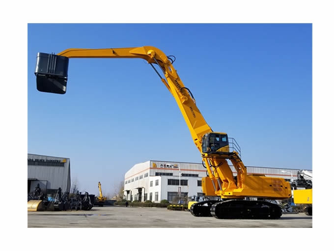該重型抓料機產品是在國內引進利勃海爾技術,即70 噸級礦山電鏟的結構基礎上, 經過優(yōu)化設計、改裝制造的具有內燃機和 380V 電動互換作業(yè)的“雙動力”發(fā)明專利產品,該 “重型高機動”節(jié)能環(huán)保散貨裝卸抓取作業(yè)設備,分別采用了大功率“國三”標準發(fā)動機、380V 西門子電機,以及全套采用施耐德控制系統(tǒng)拖動控制兩套力士樂液壓動力機構及先導液力控制的世界首臺“雙動力”抓料機。該機設計了寬體結構梁,以及加強型可更換正、負差的二節(jié)式作業(yè)主臂,最大吊重量達 25 噸、最大作業(yè)半徑為 18米。在 5 至 12 米作業(yè)半徑內,可配備 5.0 立方蚌殼抓斗,或 2.5 立方梅花廢鋼抓斗。