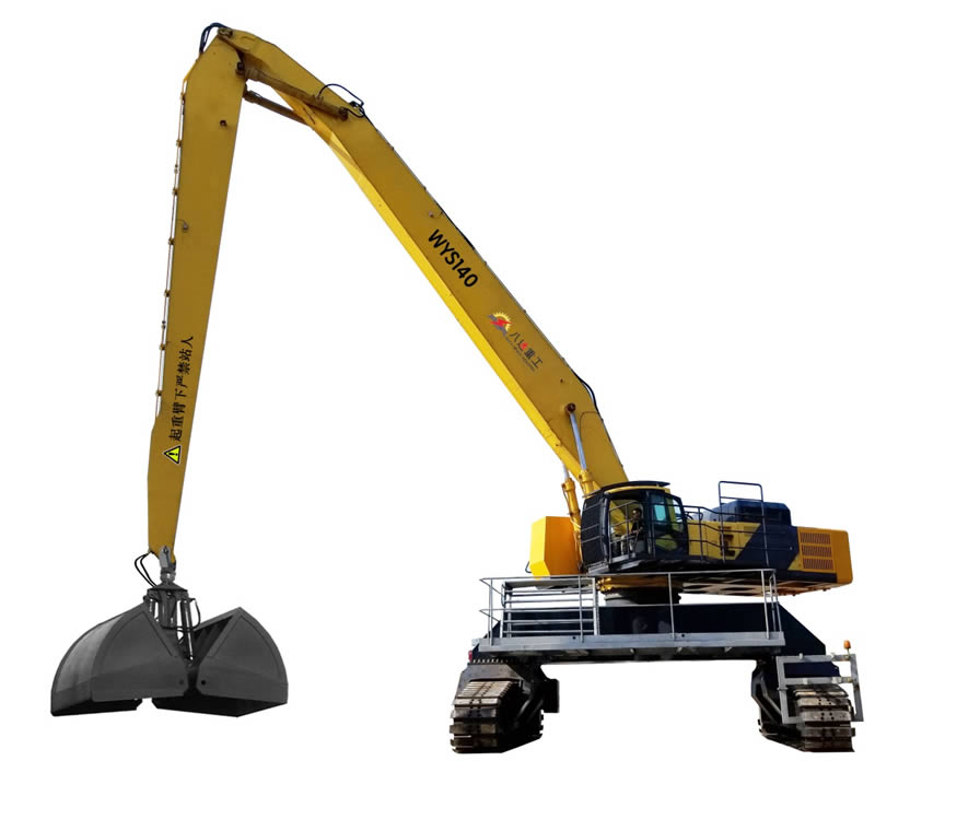 該設備分別采用原裝進口康明斯發(fā)動機、380V西門子電機,以及全套采用施耐德控制系統(tǒng)拖動控制兩套液壓動力機構,該機設計了寬體結構梁,以及加強型可更換正、負差的二節(jié)式作業(yè)主臂,最大吊重量達 25 噸、最大作業(yè)半徑為 24米。在5至12米作業(yè)半徑內,可配備 5.0 立方蚌殼抓斗,或2.5立方梅花廢鋼抓斗。