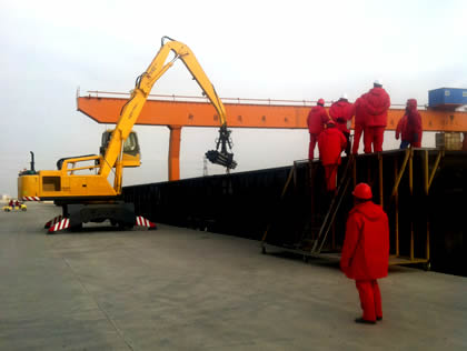 圖中所示:該抓管機(jī)正在進(jìn)行鋼管的卸火車作業(yè),卸火車裝汽車一次完成!鋼管由于太長(zhǎng),抓取時(shí)重心不太好掌握,我公司專門為其設(shè)計(jì)了專用抓具,便于抓取時(shí)掌握鋼管的重心,大大提高了鋼管的裝卸效率,受到了客戶的稱贊。