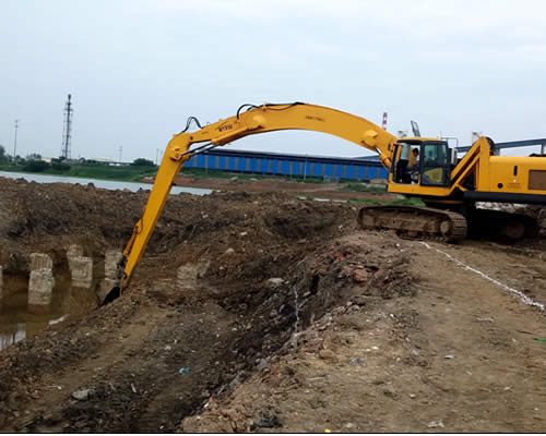 全液壓超長(zhǎng)臂挖機(jī),馳騁在河道清淤、溝渠挖掘工地中